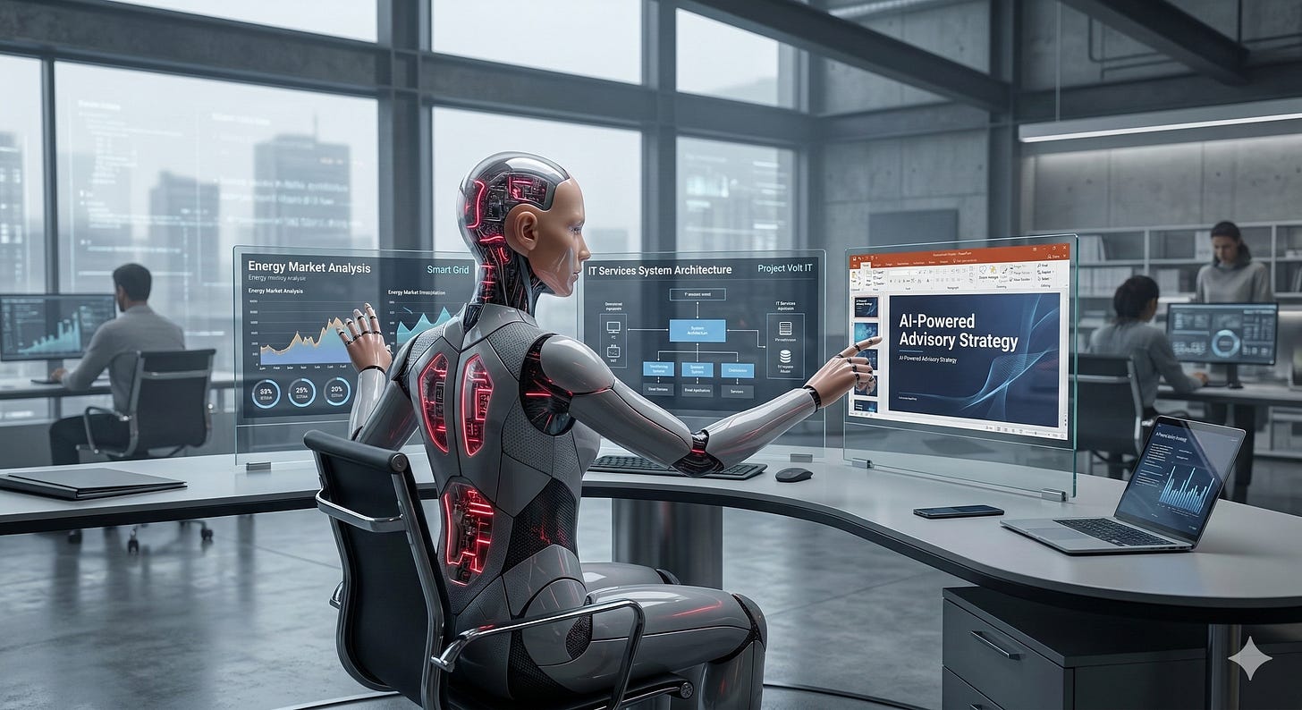 Consulting is a good example. A consultant could only work on one deck for one client at a time, limiting their earning power for the firm. That constraint is rapidly evaporating.